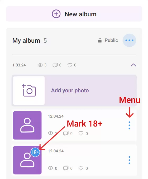Hvis det private albumet ditt ikke har et "Gjør albumet offentlig"-alternativ, inneholder albumet seksuelt innhold. For å legge ut denne typen innhold offentlig, kreves det aldersbekreftelse. Når du har fullført aldersbekreftelsen eller fjernet seksuelt innhold, blir denne funksjonen tilgjengelig.